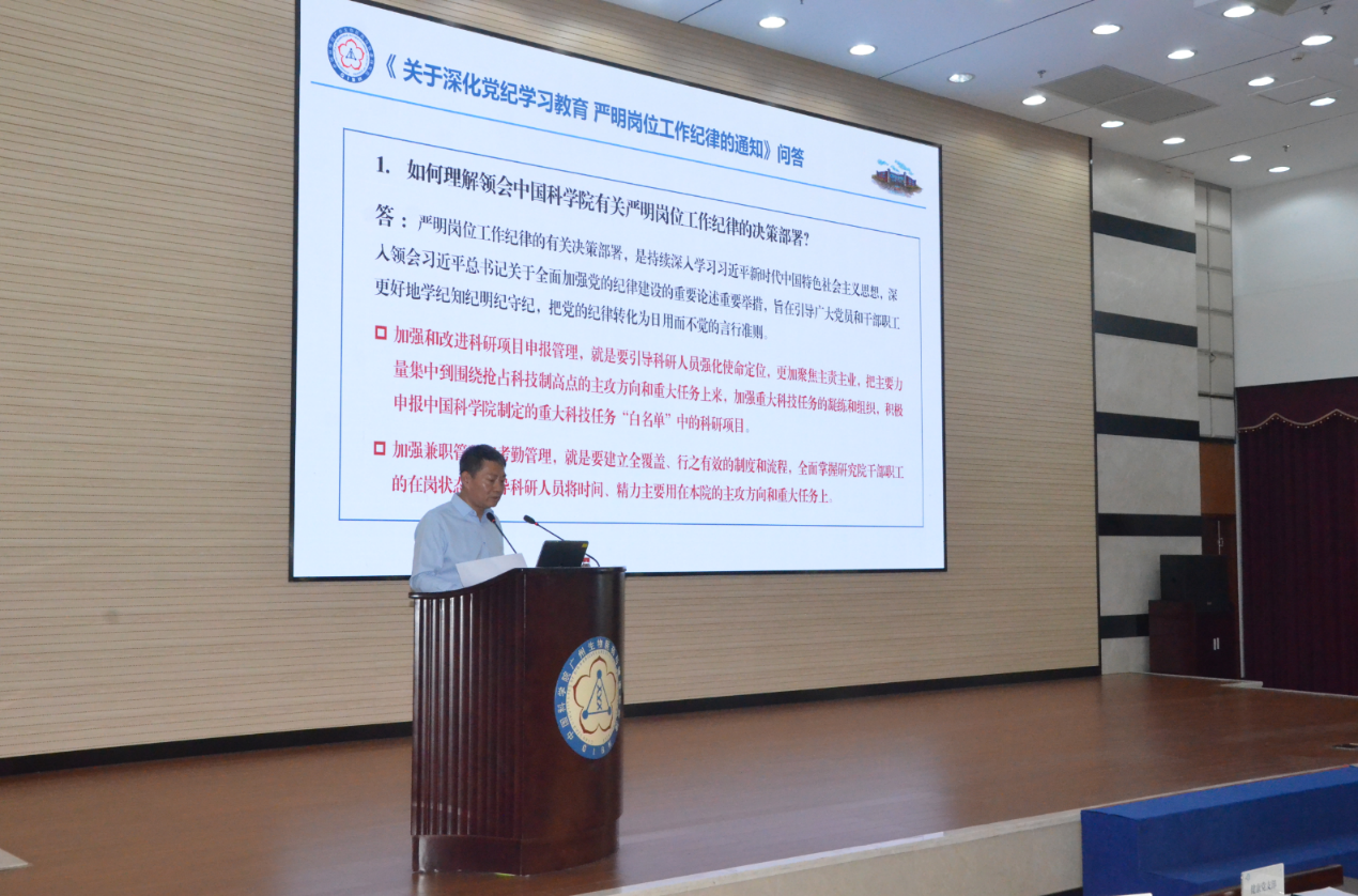 會(huì)上,張鴻翔詳細(xì)傳達(dá)并解讀了中國(guó)科學(xué)院《關(guān)于深化黨紀(jì)學(xué)習(xí)教育嚴(yán)明崗位工作紀(jì)律通知》和《關(guān)于推進(jìn)黨紀(jì)學(xué)習(xí)教育常態(tài)化長(zhǎng)效化的通知》的新精神和新要求,并對(duì)院里關(guān)于開展“深化黨紀(jì)學(xué)習(xí)教育嚴(yán)明崗位工作紀(jì)律”專項(xiàng)工作的決策部署、具體要求和研究院的落實(shí)情況進(jìn)行了全面深入的介紹和闡述。