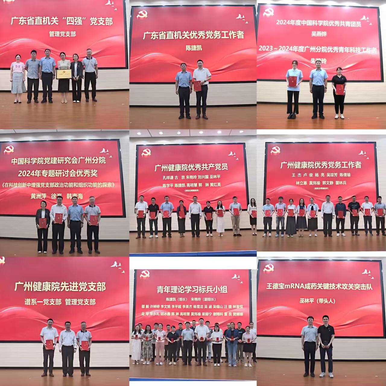 報告后,大會舉行新黨員入黨宣誓儀式,全體黨員重溫入黨誓詞。會議表彰了省直機(jī)關(guān)“四強(qiáng)”黨支部、優(yōu)秀黨務(wù)工作者、中國科學(xué)院優(yōu)秀共青團(tuán)員和廣州分院優(yōu)秀青年科技工作者、廣州健康院“兩優(yōu)一先”等先進(jìn)個人與集體,并為青年理論學(xué)習(xí)標(biāo)兵小組授章。為激勵科研尖兵勇闖“無人區(qū)”,會上為新成立的王德寶mRNA成藥關(guān)鍵技術(shù)攻關(guān)突擊隊授牌。