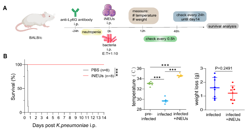 研究人員首先成功驗(yàn)證了hiPSCs來(lái)源的中性粒細(xì)胞具有典型的中性粒細(xì)胞的分子特征。而且體外制備的iNEUs展現(xiàn)出對(duì)于多種細(xì)菌的強(qiáng)效殺傷能力,包括肺炎克雷伯菌、銅綠假單胞菌、大腸桿菌和金黃色葡萄球菌等多種臨床常見(jiàn)耐藥菌。進(jìn)一步,在粒細(xì)胞缺乏癥的動(dòng)物模型實(shí)驗(yàn),向中性粒細(xì)胞功能缺陷的小鼠輸注iNEUs,可顯著提升其在多種細(xì)菌致死性感染中的存活率。有力證明了iNEUs體內(nèi)體外的強(qiáng)大抗菌能力,為致命性細(xì)菌感染的臨床治療提供了新策略,也進(jìn)一步推動(dòng)了hiPSCs來(lái)源的功能細(xì)胞在臨床治療中的轉(zhuǎn)化與應(yīng)用。