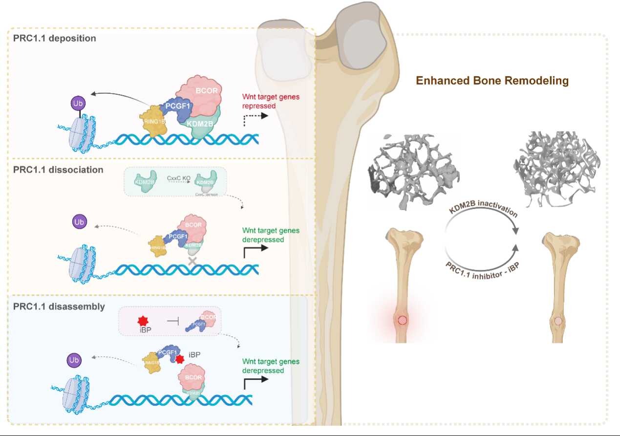 近日,中國科學院廣州生物醫(yī)藥與健康研究院聯(lián)合天津醫(yī)科大學發(fā)現(xiàn)了一種靶向PRC1.1復合物的小分子抑制劑,該小分子通過靶向抑制PRC1.1激活Wnt/β-catenin信號通路,從而促進骨形成。相關(guān)成果以Targeted disruption of PRC1.1 complex enhances bone remodeling為題,在線發(fā)表于Nature Communications期刊。