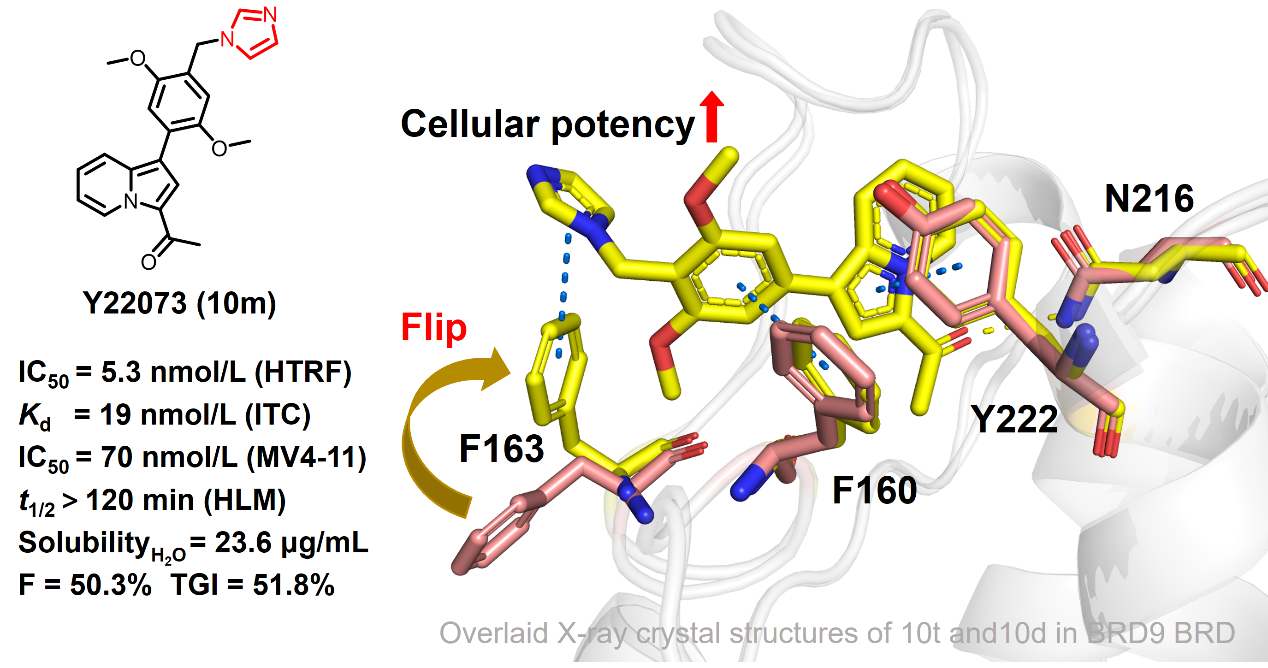 近日,中國科學院廣州生物醫(yī)藥與健康研究院許永團隊針對溴結(jié)構(gòu)域家族蛋白抑制劑選擇性難題,報道了一種在急性髓系白血?。ˋML)治療中具有顯著療效的BRD9選擇性抑制劑Y22073(專利申請?zhí)枺?025100176011.1),為AML 精準治療提供了全新解決方案。相關(guān)成果以“Key imidazolyl groups that induce phenylalanine flipping enhance the efficacy of oral BRD9 inhibitors for AML treatment”為題發(fā)表于藥物化學領(lǐng)域Top期刊Acta Pharmaceutica Sinica B上。