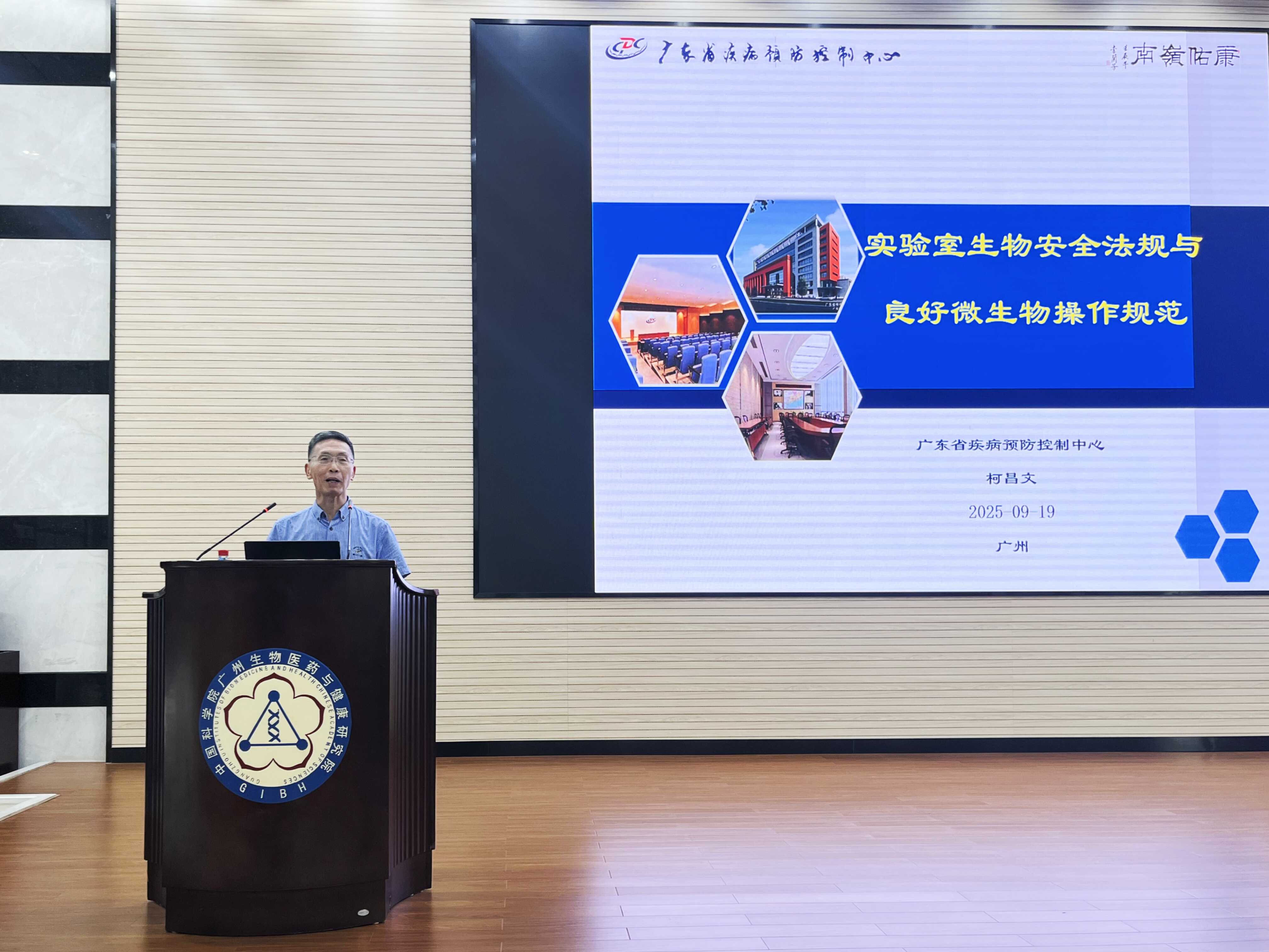 9月19日,中國科學(xué)院廣州生物醫(yī)藥與健康研究院(簡稱 “廣州健康院”)舉辦“2025年度生物安全專題培訓(xùn)”,特邀廣東生物疾病預(yù)防與控制中心柯昌文教授主講。培訓(xùn)會(huì)由馮立強(qiáng)研究員主持,蔡陳崚副院長出席并致辭,全院150余名師生參加。