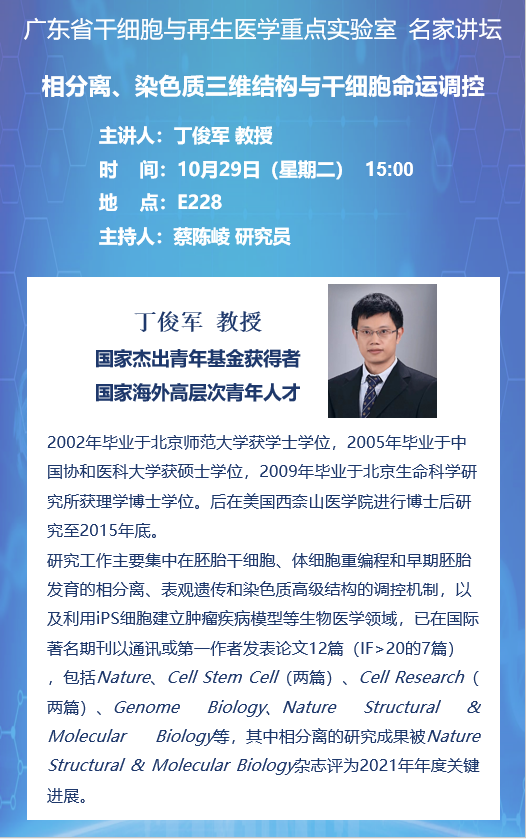 2024年10月29日廣東省干細胞與再生醫(yī)學重點實驗室名家講壇:相分離、染色質三維結構與干細胞命運調控
